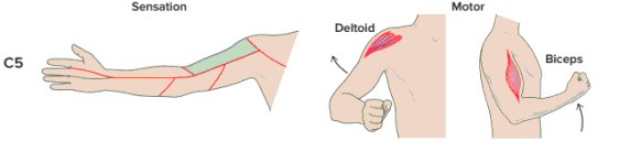 • C5 : Innervates the deltoid and biceps and gives sensation to the dermatome over the deltoid.