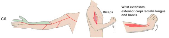 - C6 : innervates the dermatome over the lateral forearm and hand and innervates the wrist extensors.