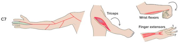 - C7 : innervates the small dermatome over the middle finger plus the triceps, wrist flexors and finger extensors.