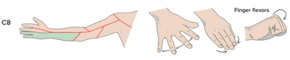 - C8 : supplies the dermatome of the medial hand and forearm plus the finger flexors.