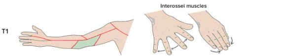 - T1 : supplies the intrinsic muscles of the hand, the interossei, and the dermatome on the medial upper arm.